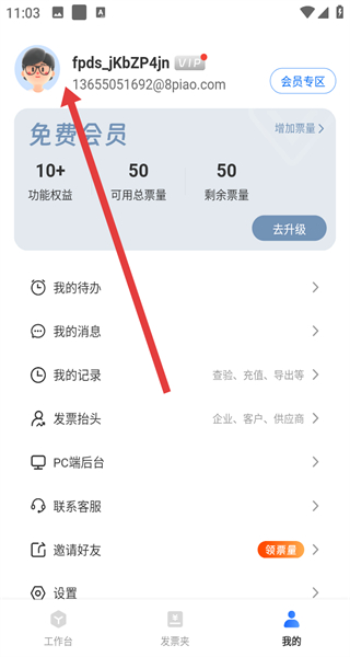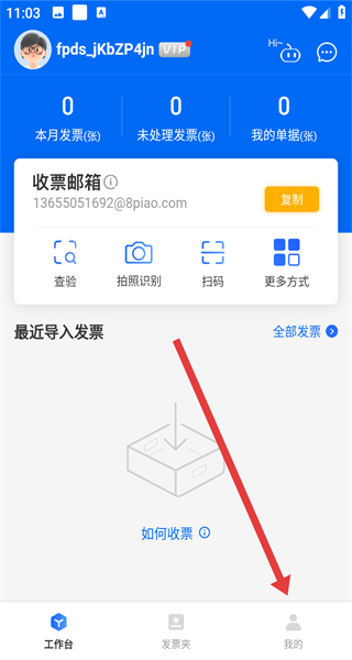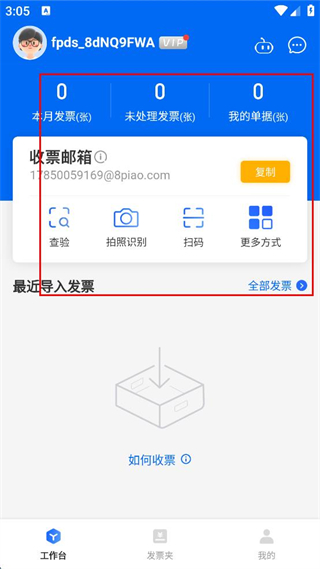 3、登錄后進(jìn)入工作臺(tái),可查看本月發(fā)票、未處理發(fā)票等數(shù)據(jù),以及收票郵箱信息。