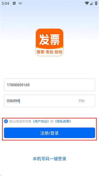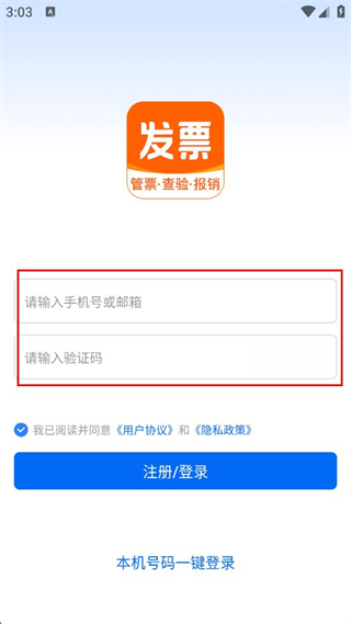 1、打開(kāi)發(fā)票管理軟件,在登錄頁(yè)面輸入手機(jī)號(hào)或郵箱,點(diǎn)擊獲取驗(yàn)證碼并輸入。