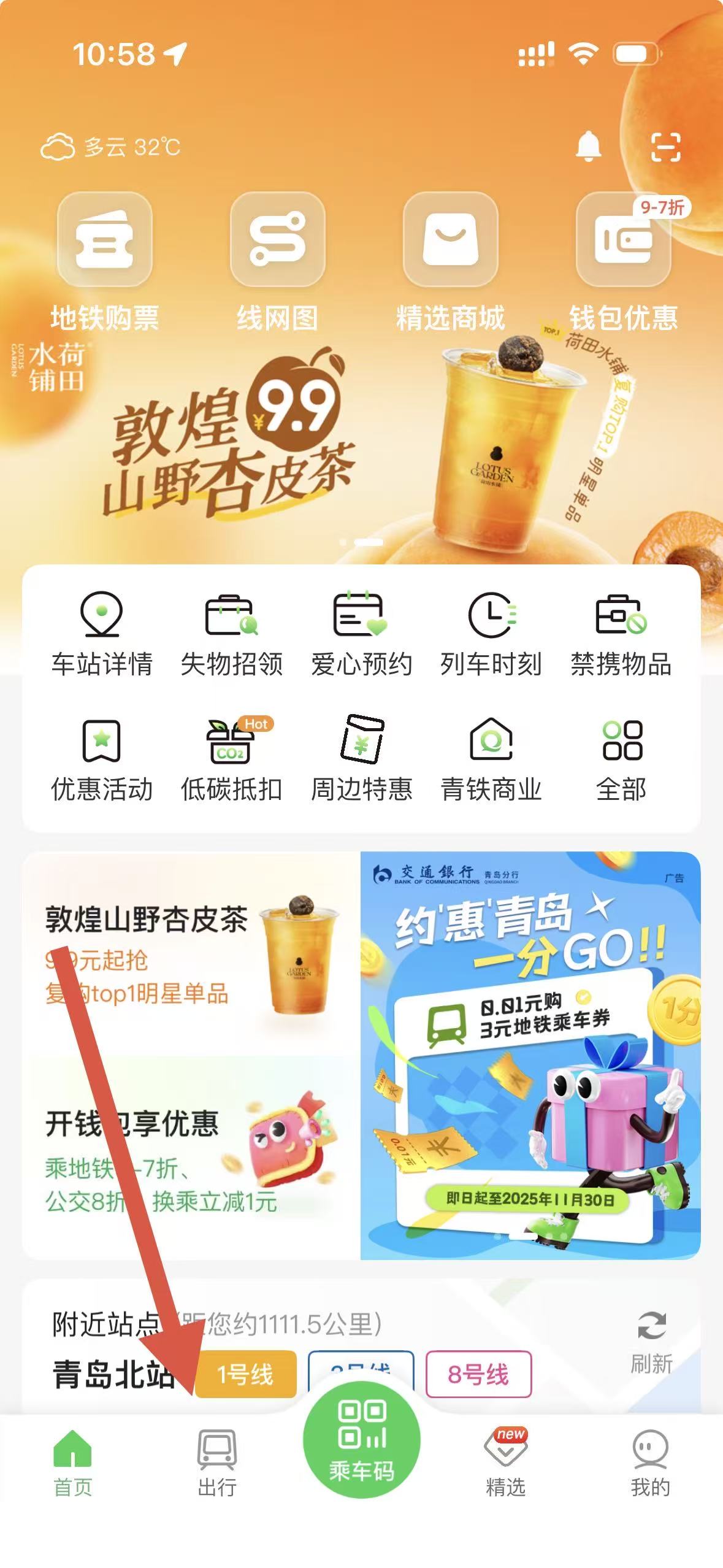 1、打開(kāi)地鐵相關(guān)APP進(jìn)入首頁(yè),點(diǎn)擊底部出行選項(xiàng)進(jìn)入出行頁(yè)面。