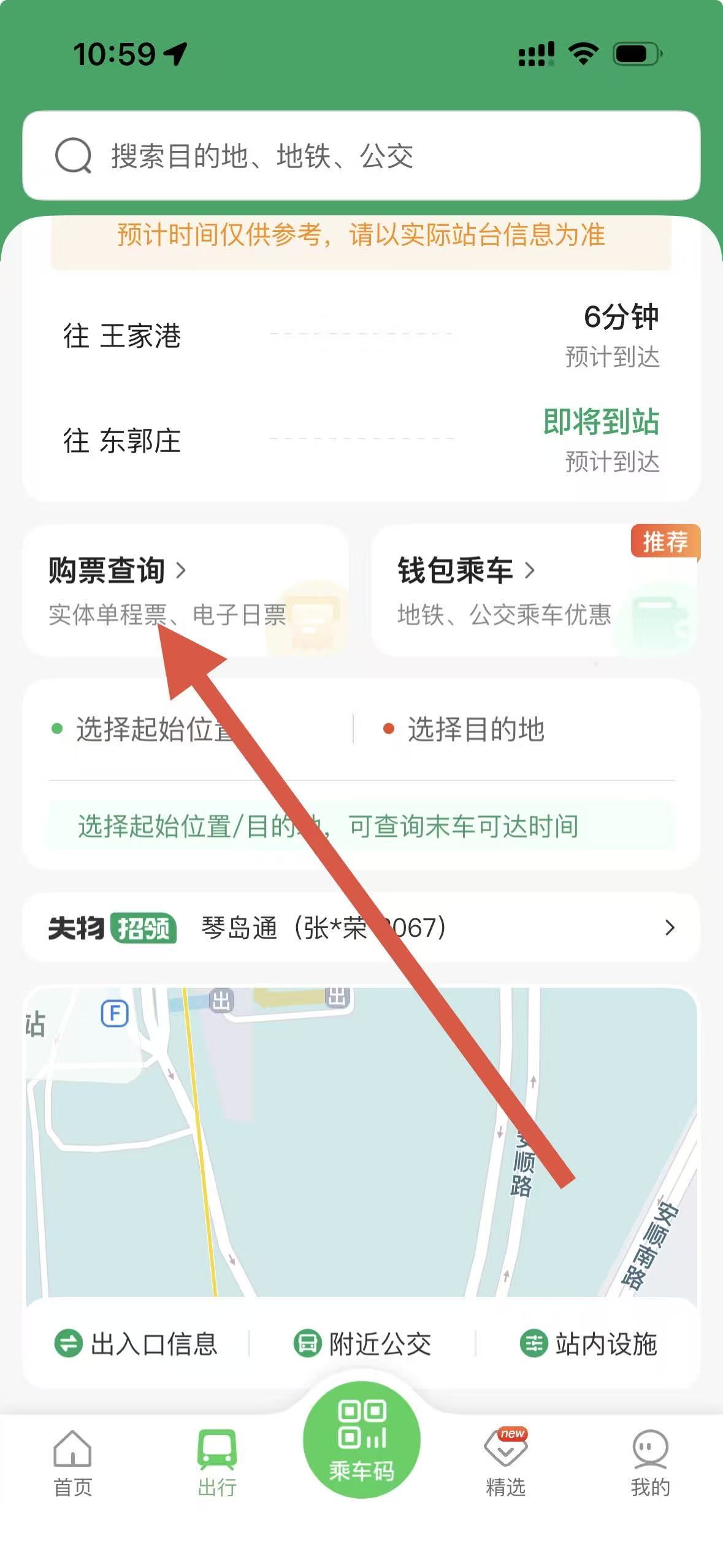 3、在出行頁(yè)面中,點(diǎn)擊購(gòu)票查詢進(jìn)入地鐵購(gòu)票界面。