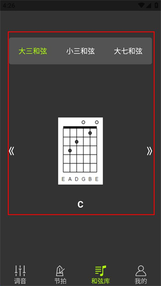 4、進入和弦?guī)旖缑?,查看大三和弦下的C和弦指法圖。