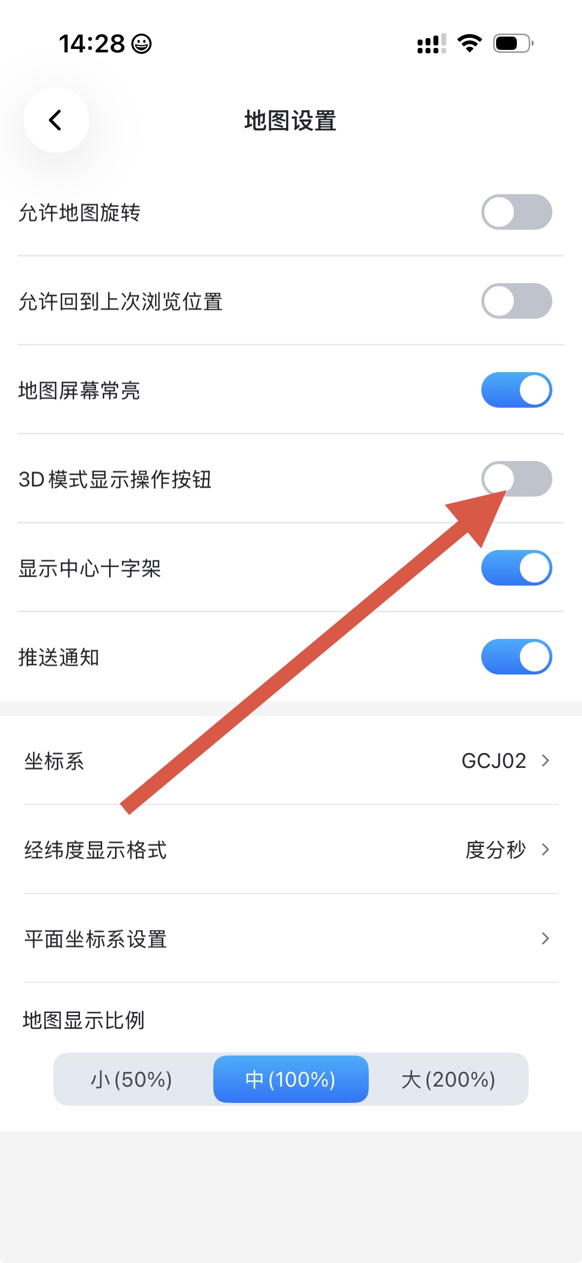 4、在地圖設(shè)置頁(yè)面,找到3D模式顯示操作按鈕選項(xiàng),點(diǎn)擊開(kāi)啟其開(kāi)關(guān),即可啟用3D模式顯示操作按鈕。