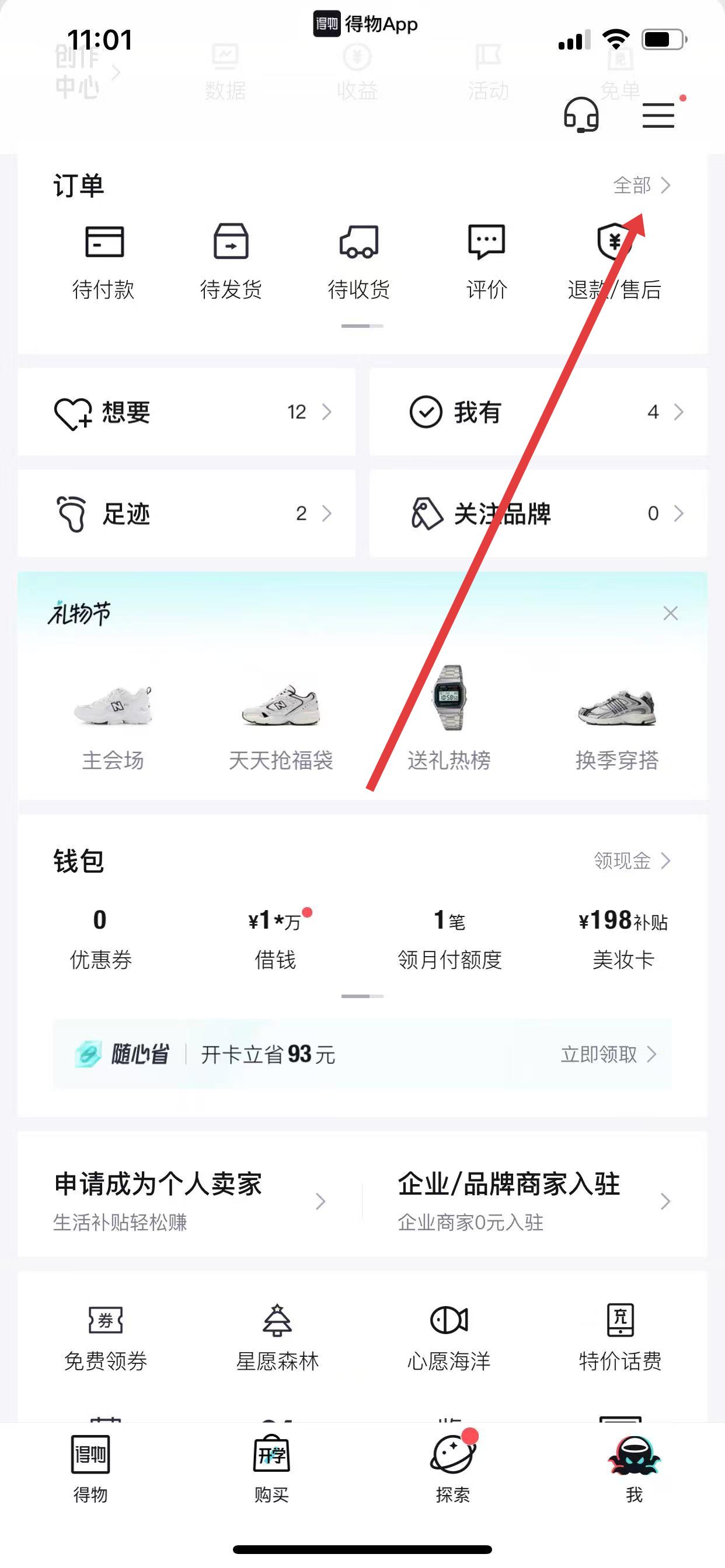 1、打開得物APP,在訂單板塊點(diǎn)擊全部,進(jìn)入全部訂單頁面。