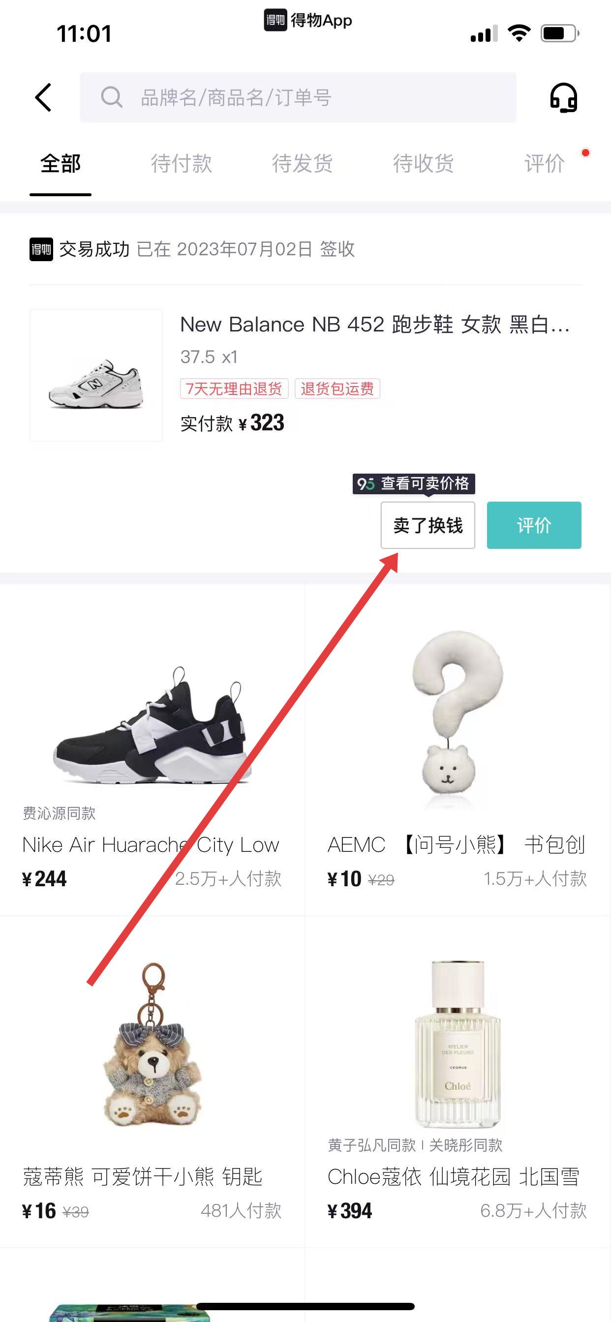 2、在全部訂單中,找到想商品的右方的賣了換錢按鈕。