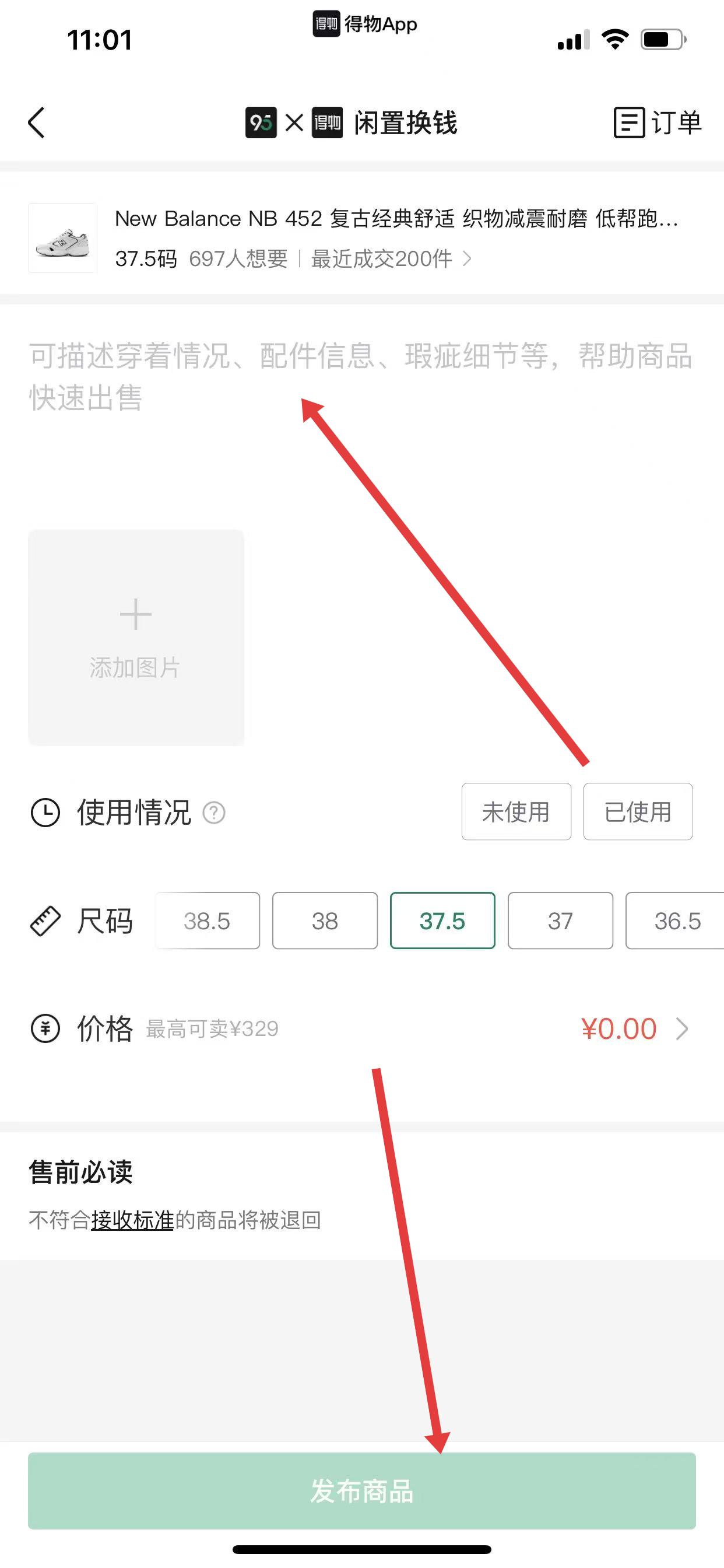 3、進(jìn)入閑置換錢頁面,填寫商品穿著情況、配件信息等,添加商品圖片,選擇使用情況和尺碼,設(shè)置價(jià)格,點(diǎn)擊發(fā)布商品。