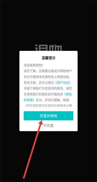 1、在打開得物App后,可以通過點(diǎn)擊彈窗中的同意并繼續(xù)按鈕,進(jìn)入使用。