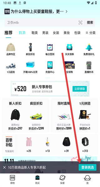 2、在進(jìn)入到得物首頁中時(shí),可以點(diǎn)擊下方登錄挑選按鈕,登錄后開始使用。