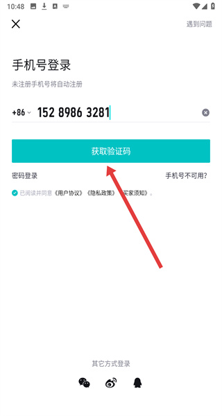 3、在跳轉(zhuǎn)到登錄頁面中,點(diǎn)擊輸入框填寫好手機(jī)號后,點(diǎn)擊下方獲取驗(yàn)證碼按鈕進(jìn)行登錄。