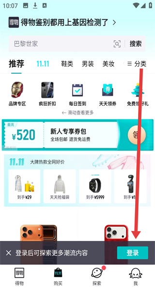 1、在進(jìn)入到得物首頁時(shí),可以點(diǎn)擊下方登錄按鈕,進(jìn)行登錄操作。