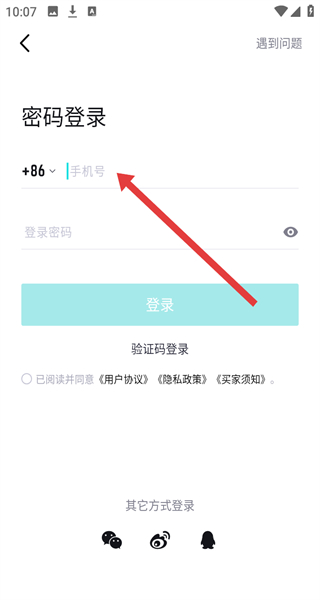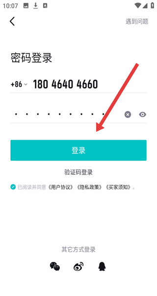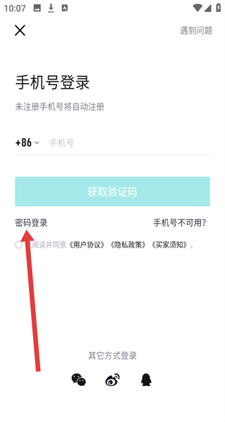 2、在進(jìn)入到手機(jī)號登錄頁面后,可以點(diǎn)擊下方密碼登錄按鈕,切換登錄方式。