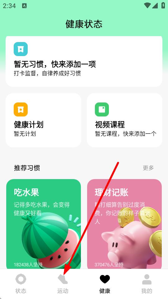 1、打開運(yùn)動健康類app,點(diǎn)擊底部導(dǎo)航欄中的運(yùn)動選項(xiàng)。