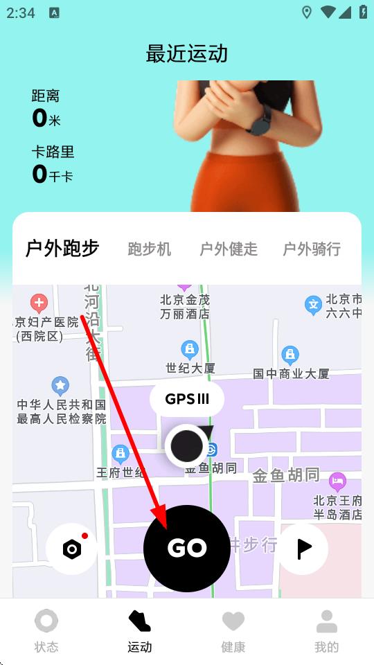 2、在最近運(yùn)動界面,選擇運(yùn)動模式,點(diǎn)擊下方的GO按鈕開始運(yùn)動。