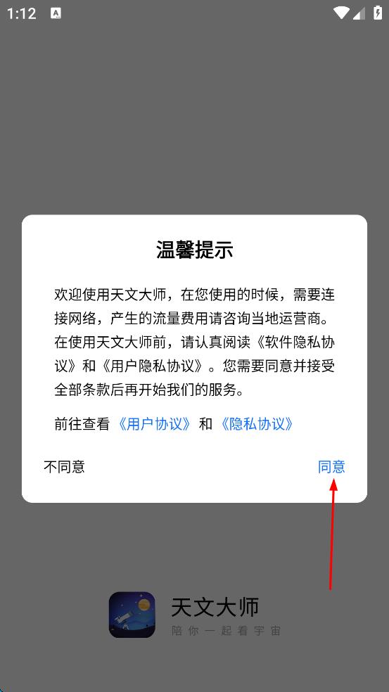 1、打開天文大師,會出現(xiàn)溫馨提示界面,仔細閱讀后點擊“同意”,進入首頁。