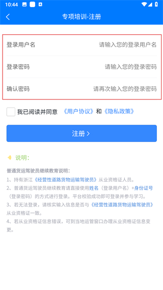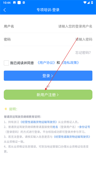 3、在專項培訓登錄頁面,點擊新用戶注冊按鈕。