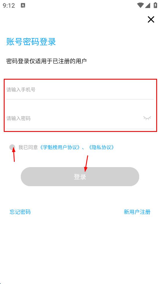 4、在登錄界面,輸入手機號和密碼,勾選我已同意學魁榜用戶協(xié)議,隱私協(xié)議,點擊“登錄”按鈕完成登錄。