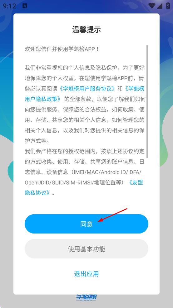 1、打開學魁榜APP,進入后會看到溫馨提示頁面,點擊“同意”按鈕,進入APP主界面。
