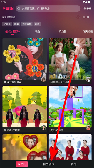 1、打開甜拍APP,點(diǎn)擊底部導(dǎo)航欄中的自由創(chuàng)作選項(xiàng)。