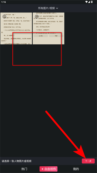 2、進(jìn)入自由創(chuàng)作頁(yè)面后,選擇想要用于制作視頻的圖片或視頻素材,選好后點(diǎn)擊下一步。
