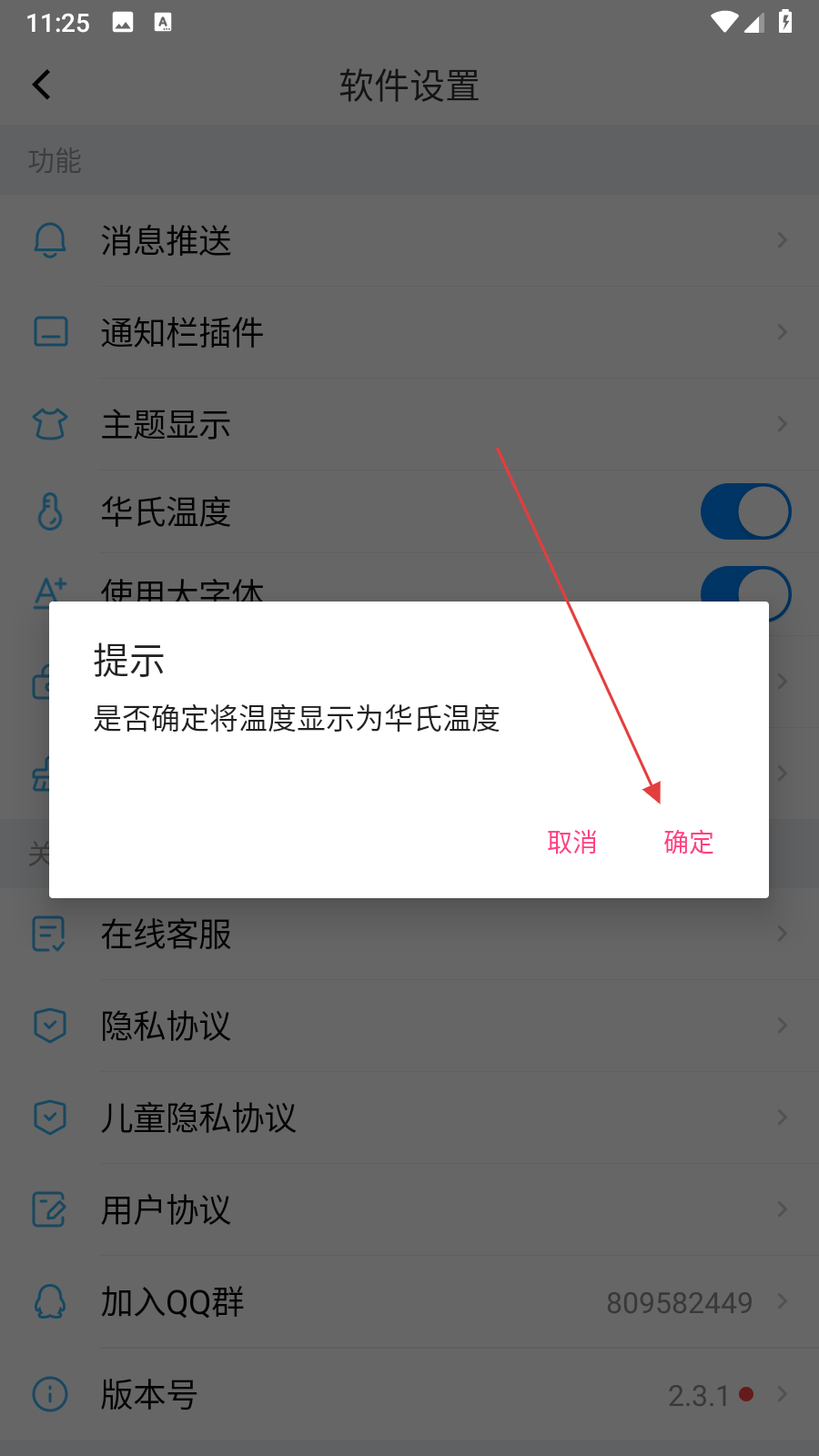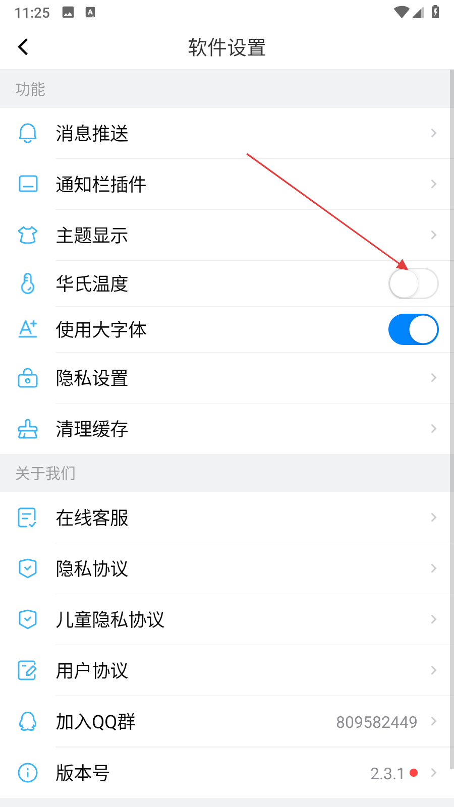 2、在軟件設置頁面中,找到華氏溫度選項,點擊其右側的開關按鈕。