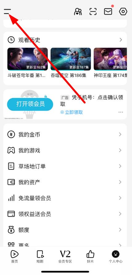 2、在個(gè)人中心界面,點(diǎn)擊左上角三條橫線的菜單圖標(biāo)展開(kāi)更多服務(wù)選項(xiàng)。