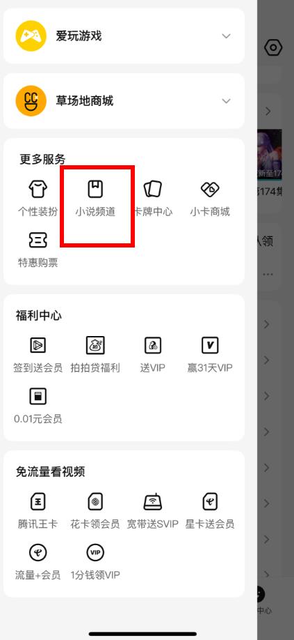 3、在展開(kāi)的更多服務(wù)選項(xiàng)中,找到并點(diǎn)擊小說(shuō)頻道即可進(jìn)入騰訊視頻小說(shuō)頁(yè)面瀏覽小說(shuō)。