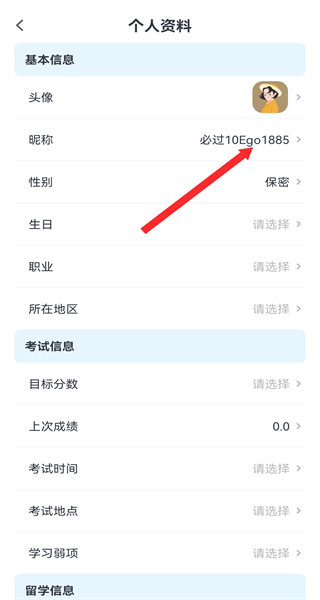 3、在個人資料的頁面,點擊昵稱區(qū)域,進入修改昵稱的頁面。