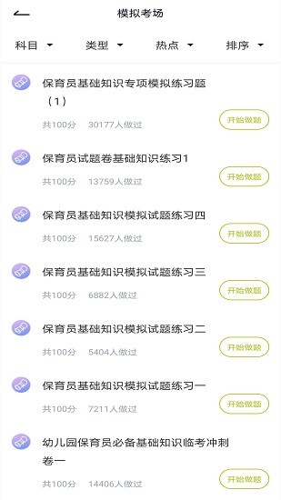 新增模擬考試功能,保育員可按照自我練習(xí)的考點(diǎn)選擇相對(duì)應(yīng)的模擬試卷,也可選擇搭配好的模擬整卷考試。