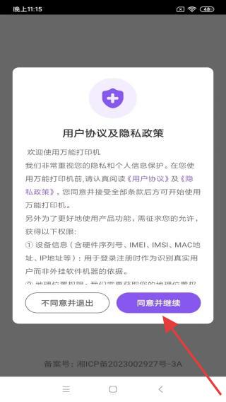 1、打開萬能打印機APP,進入時會彈出用戶協(xié)議及隱私政策,點擊同意并繼續(xù)的按鈕。