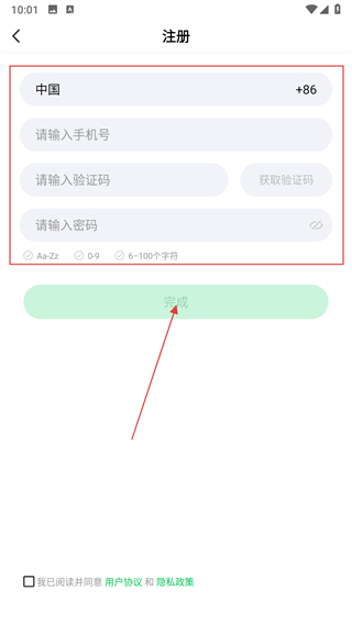 4、在注冊頁面,依次輸入手機(jī)號、獲取并輸入驗證碼、設(shè)置密碼,點擊完成按鈕,即可完成注冊。