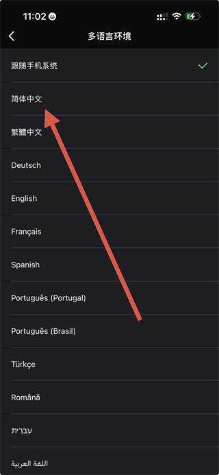 4、在多語言環(huán)境頁面,選擇要切換的語言,如簡體中文,即可完成語言設(shè)置切換。