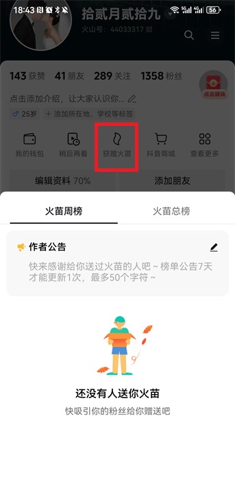 4、在個人主頁中就可以看到【獲贈火苗】點擊就可以查看到獲贈的火苗數(shù)量。