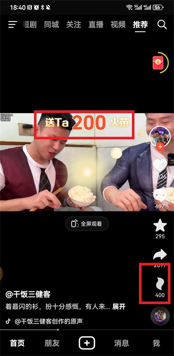 2、在視頻作品界面,用戶需要點擊右下角的【火苗】標志,就可以給作品還有作者贈送火苗,連續(xù)點擊就可以連續(xù)的贈送火苗;