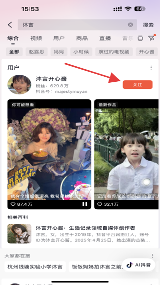 2、在搜索框中輸入要關(guān)注的抖音號名稱,然后點擊搜索的功能按鈕。