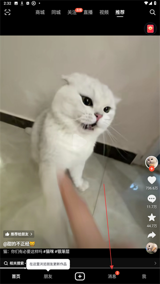 1、打開火山小視頻,進入時點擊下方消息的功能按鈕。