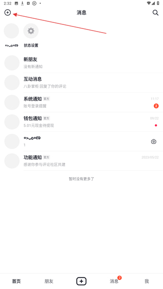 2、進入消息的頁面內(nèi),點擊左上角+的功能按鈕。