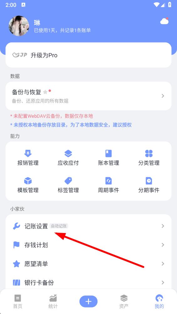 2、在我的頁(yè)面里,找到并點(diǎn)擊記賬設(shè)置的選項(xiàng)。
