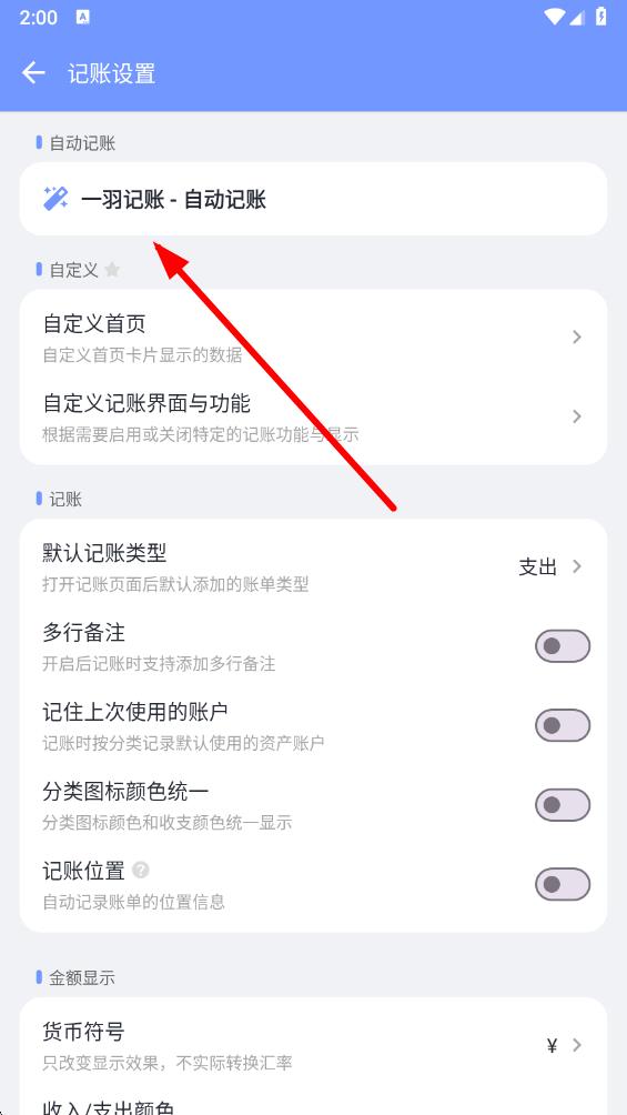 3、進(jìn)入記賬設(shè)置頁(yè)面后,點(diǎn)擊一羽記賬自動(dòng)記賬選項(xiàng)。