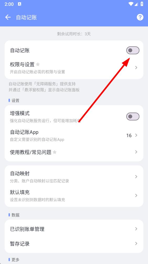 4、在自動(dòng)記賬頁(yè)面,點(diǎn)擊自動(dòng)記賬右側(cè)的開(kāi)關(guān)按鈕將其開(kāi)啟,根據(jù)提示完成權(quán)限設(shè)置等相關(guān)操作,即可啟用自動(dòng)記賬功能。
