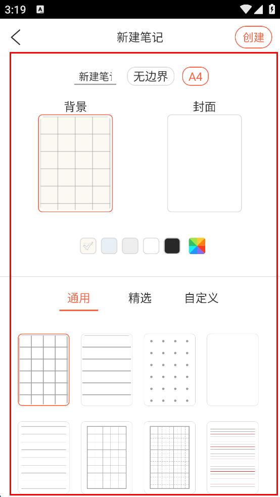 3、進(jìn)入新建筆記頁面,在頁面中選擇筆記的背景、封面等樣式,也可在通用、精選、自定義選項(xiàng)中挑選合適的筆記模板。