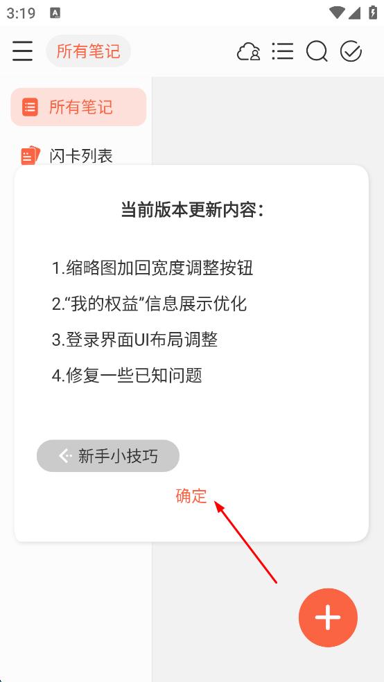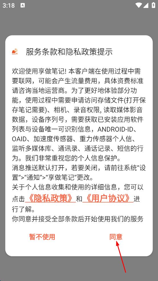 1、打開享做筆記APP,在服務(wù)條款和隱私政策提示頁面,點(diǎn)擊“同意”,進(jìn)入版本更新內(nèi)容頁面后,點(diǎn)擊“確定”。