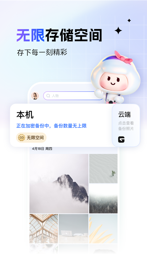 1、永久無限空間:你可以無限量以原畫質(zhì)備份照片與視頻,切換任意手機設(shè)備都能訪問這些內(nèi)容。開啟自動備份,美好回憶永不丟失,你也可以選擇從手機本地導(dǎo)入照片視頻。