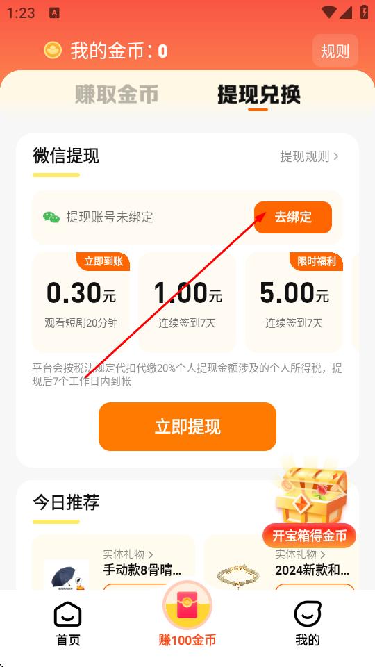 3、進(jìn)入提現(xiàn)兌換頁面后,點擊微信提現(xiàn)欄的去綁定,完成微信賬號的綁定。