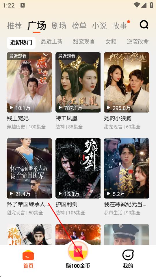 1、打開全民短劇APP,點擊底部導(dǎo)航欄中間的賺100金幣。