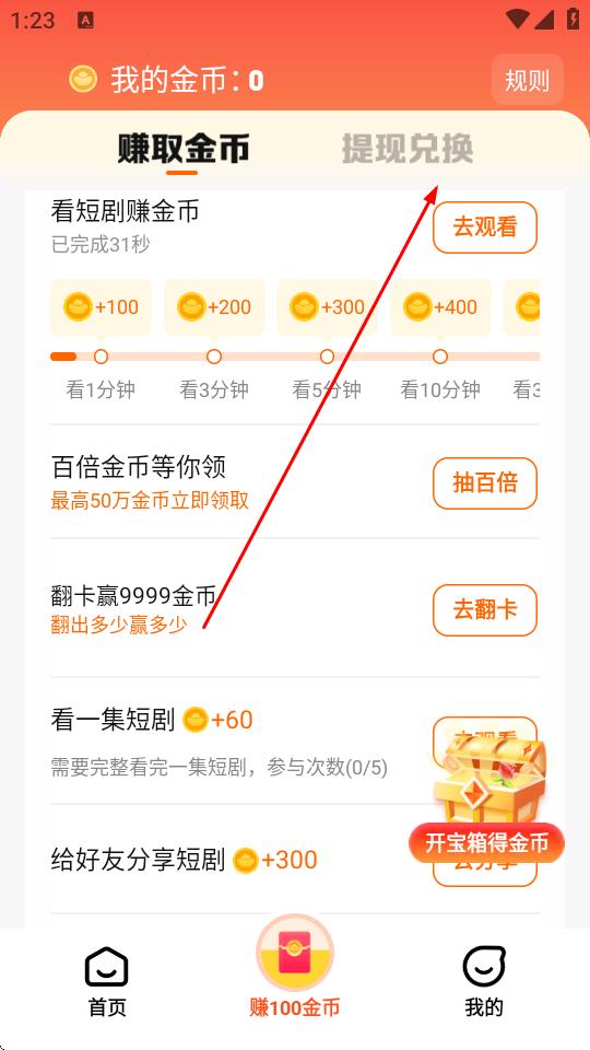 2、在賺取金幣頁面,點擊右上角的提現(xiàn)兌換選項。