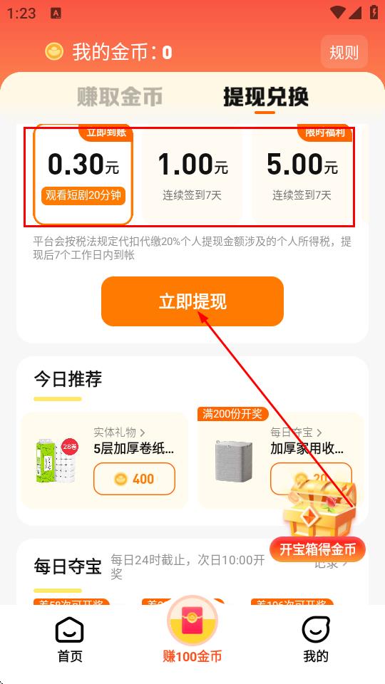 4、綁定完成后,選擇提現(xiàn)金額,點擊立即提現(xiàn)按鈕,即可將金幣兌換成現(xiàn)金提現(xiàn)到微信。