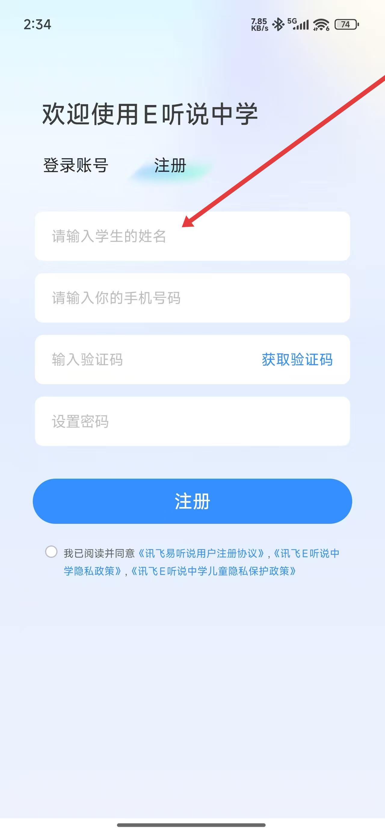 3、注冊頁點(diǎn)擊請輸入學(xué)生的姓名輸入框,激活輸入狀態(tài),準(zhǔn)備填寫信息完成注冊。