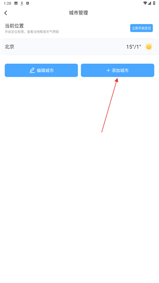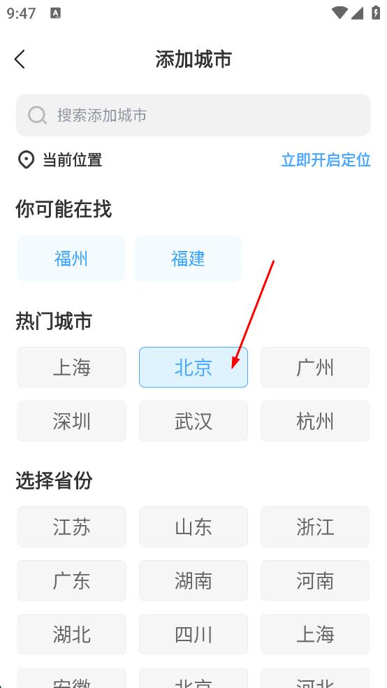 2、在APP主界面,進(jìn)入添加城市頁(yè)面,選擇要查看天氣的城市,比如點(diǎn)擊“北京”。