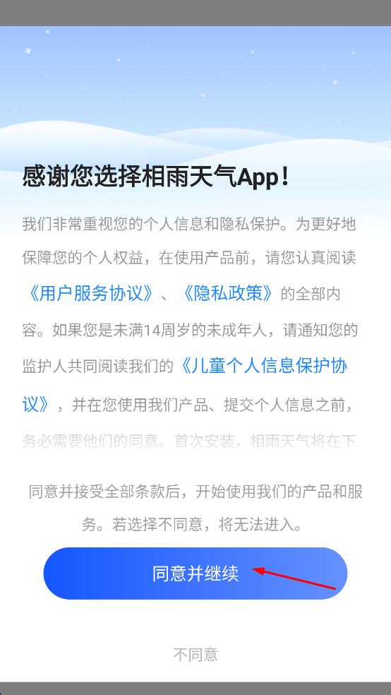 1、打開(kāi)相雨天氣APP,在彈出的協(xié)議頁(yè)面,點(diǎn)擊“同意并繼續(xù)”按鈕,進(jìn)入APP主界面。