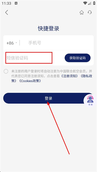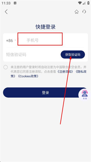 3、在快捷登錄頁(yè)面,輸入手機(jī)號(hào),點(diǎn)擊獲取驗(yàn)證碼。