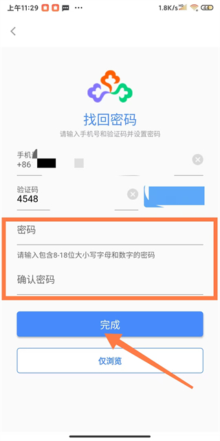 3、在驗證碼輸入,設置新密碼點擊完成按鈕,即可完成密碼找回操作。